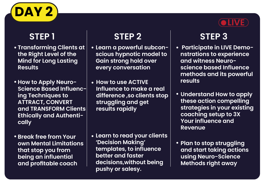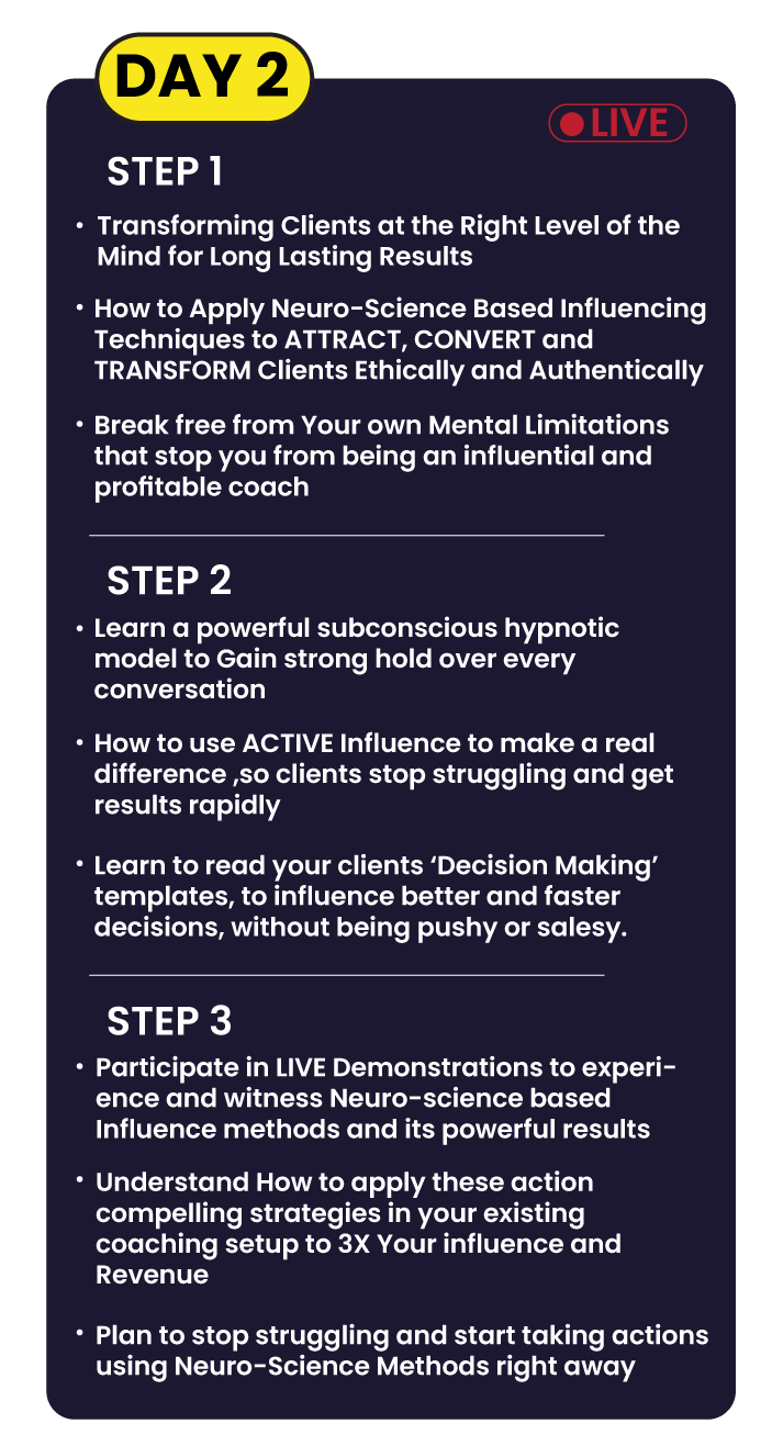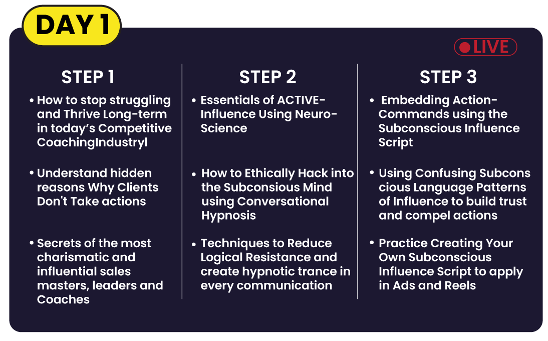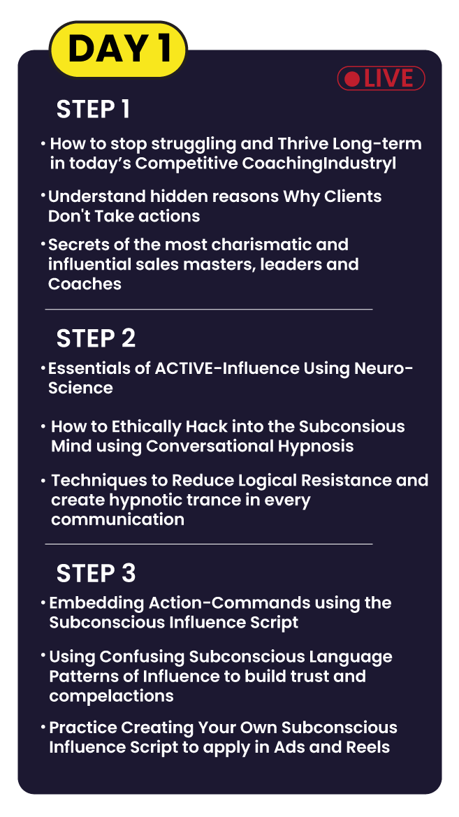 In this workshop, I’ll equip you with quick-action hypnosis tools, advanced NLP techniques, and secret subconscious influence strategies so you can: